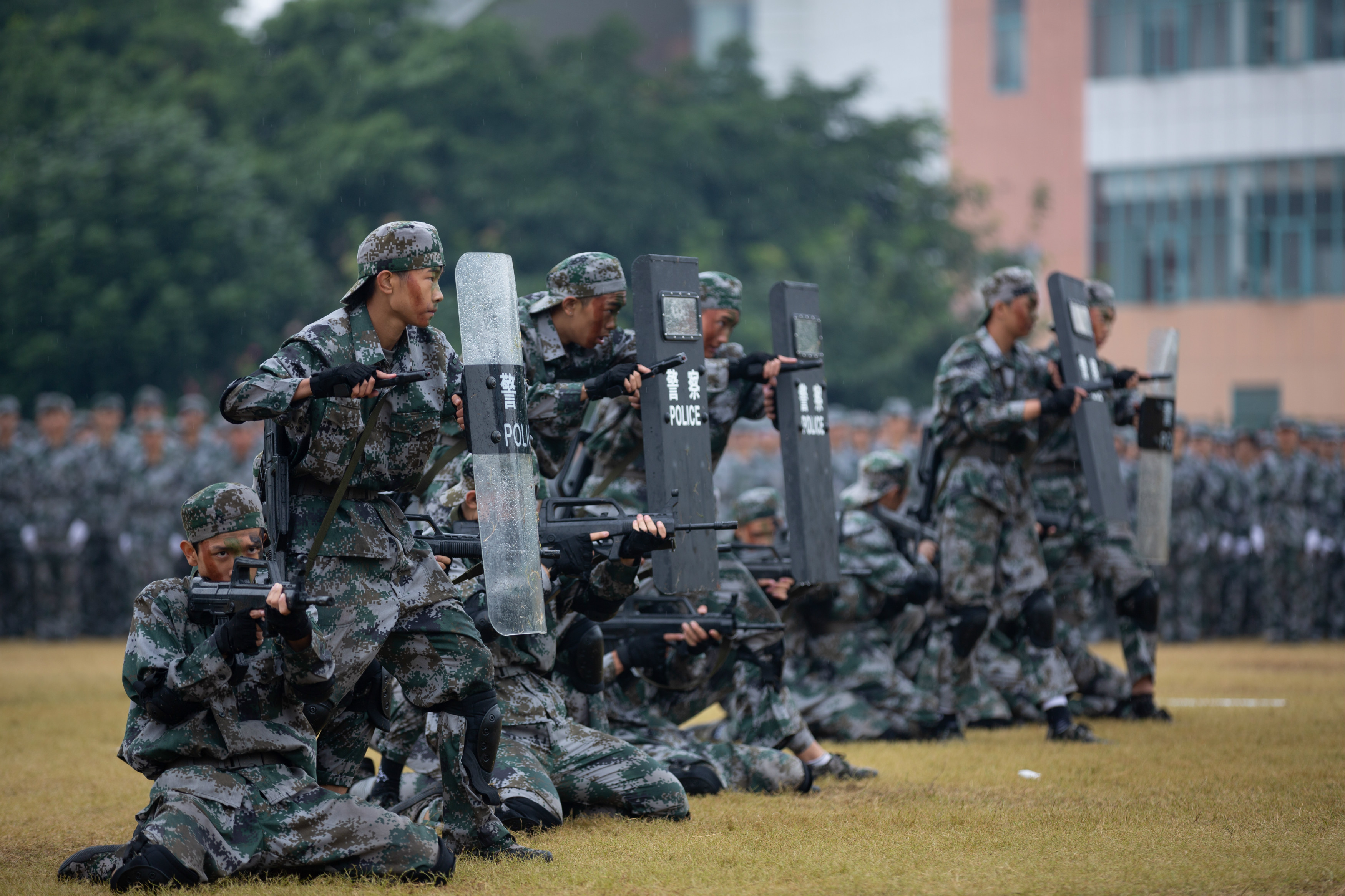 汇报表演随着《分列式进行曲》正式开始。分列式方阵队伍迈着整齐的步伐、喊着嘹亮的口号,依次走过检阅台,赢得了在场老师和同学的阵阵掌声;干净利落的匕首操,彰显着军营的英姿飒爽;刚劲有力的擒敌拳,挥洒的是不悔的青春;花式表演方队精心准备了排字“1949——2019” “祖国万岁”“70”等字样,并用手语操《国家》等节目祝福新中国70华诞;摔擒、应急棍、实战战术表演……汇演节目精彩纷呈,新生们意气风发、斗志昂扬,展现了我校学子乐观自信、奋发向上、砥砺前行的青春风采。