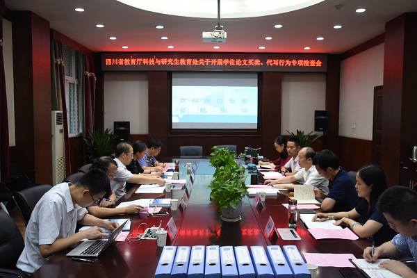【本网讯】9月6日上午,四川省教育厅专家组到我校开展学位论文买卖、代写行为专项检查会。专家组听取了我校关于学位论文买卖、代写自查情况的汇报,分组与师生代表座谈,进行了实地考察和资料查阅,并当场给出了意见反馈。学校副校长何建新,教务处、学生处、研究生处的负责人,相关工作人员和师生代表参加了会议,会议由何建新主持。