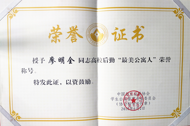 廖明全荣获2018年全国高校后勤 “最美公寓人”称号