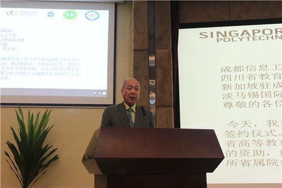 何建新对参加签约仪式的嘉宾表示诚挚的感谢和热烈的欢迎,并介绍了我校在工程教育改革方面所做出的努力和取得的成绩。自2015年起,我校与新加坡理工学院进行了多次商讨及互访,以确保CDIO教师培训项目顺利开展。该项目是淡马锡国际基金会在中国资助的第一个项目,我校作为主办方,联合电子科技大学成都学院、西华大学和成都东软学院的共同开展,约120名教师参与项目,希望通过该项目能让更多的老师将此套教学法应用到实际教学中,让学生受益,同时也为四川省的工程教育作出更多的贡献。