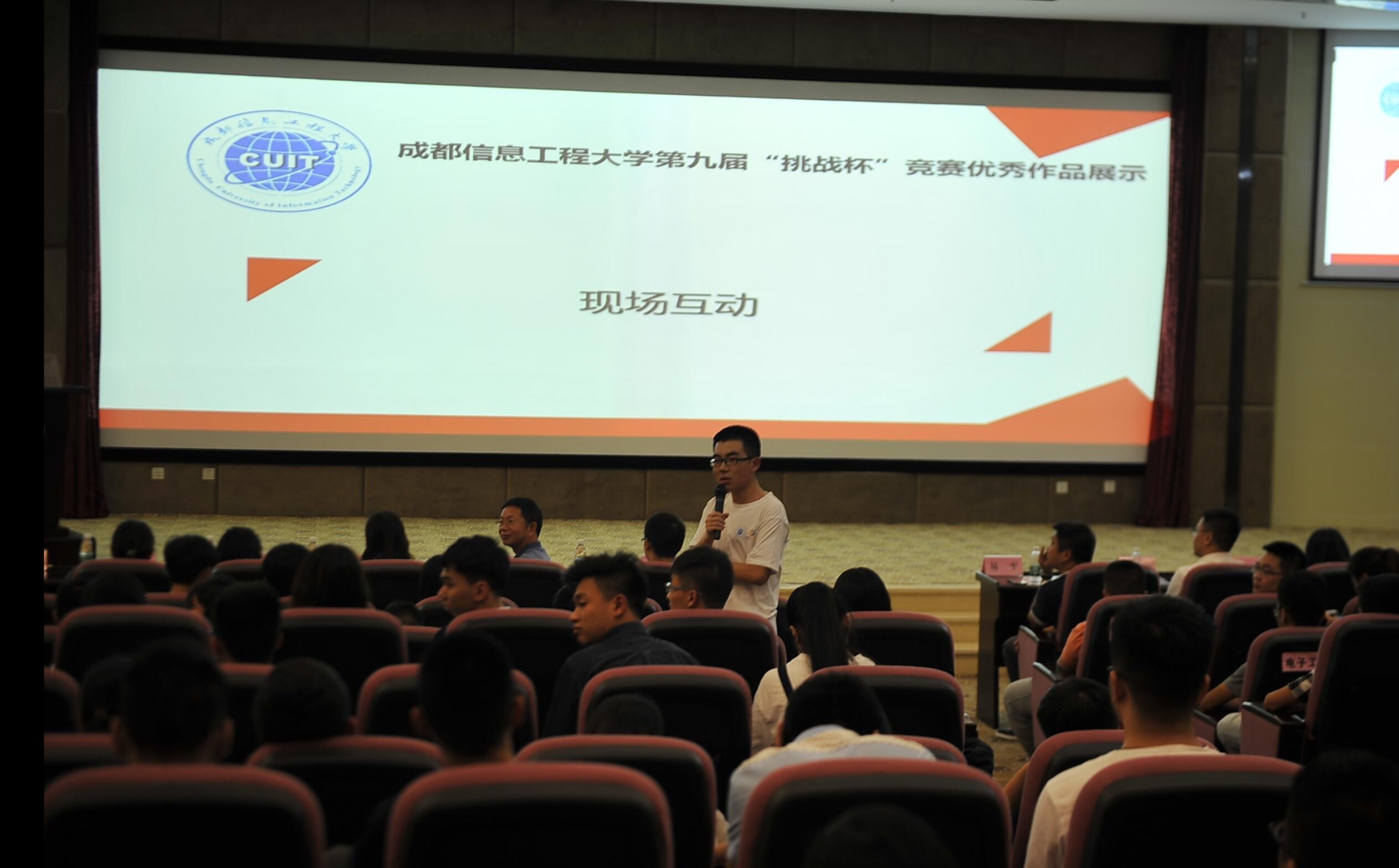 本次活动邀请了《人影高炮作业数据自动采集及智能测试系统》等5支优秀项目团队作路演展示。在观看了学校第九届 “挑战杯”大学生课外学术科技作品竞赛总结视频后,5支团队负责人依次上台展示。他们分别从项目研发背景、先进性与创新点、取得的成果、商业价值及意义等方面对各自的项目进行了展示,并与在场的观众分享了他们的参赛经验和感受。