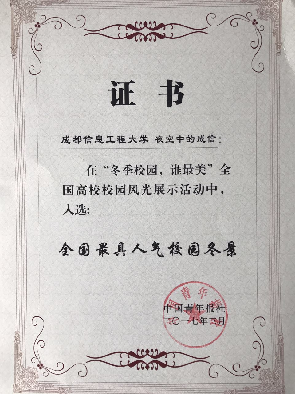 2016年12月,中国青年报社面向高校,发起“冬季校园,谁最美”高校校园风光展示活动,我校广大学生在校团委的组织下积极创作作品参与投稿,在中国青年报的微信公众号上展示了成信大冬季校园美景。此次入选的作品《夜空中的成信》,由我校学生张雪峰创作,他从俯视的角度拍摄,将校园建筑和环境与夜空及周边的整体环境有机融合,展现了夜幕降临,华灯初上时分成信大美丽的夜景,获得了活动主办方和网络受众的好评。
