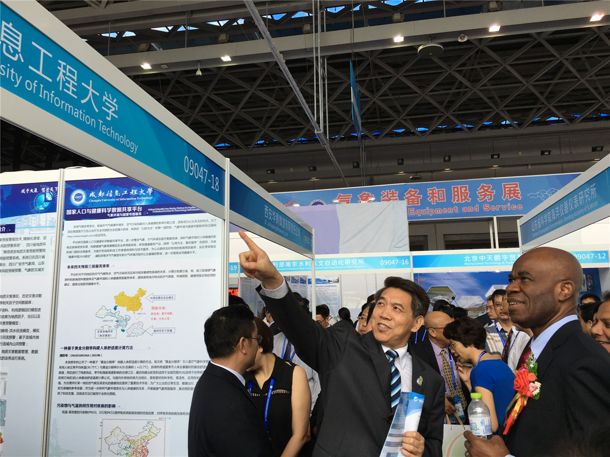 开幕式后,郑国光与东盟国家及国际组织的代表一同参观了展览,郑国光在参观我校展区时听取了我校党委副书记敬枫蓉的汇报。在汇报时敬枫蓉指出,爱体育网页版长期从事气象装备研发与气象服务产品开发,此次参展项目均是我校教师依托科研项目形成的科研成果转化,科研成果只有产品化才能真正形成了生产力,此次参展,既是我校科研成果的汇报与展示,也更希望通过展会与更多的单位开展合作,共同为中国、东盟国际乃至全球的气象事业发展贡献成信人的力量。参观后,郑国光还饶有兴趣的亲自用英语向WMO发展和区域活动司司长Yinka Adebayo介绍我校的前身“成都气象学院”。