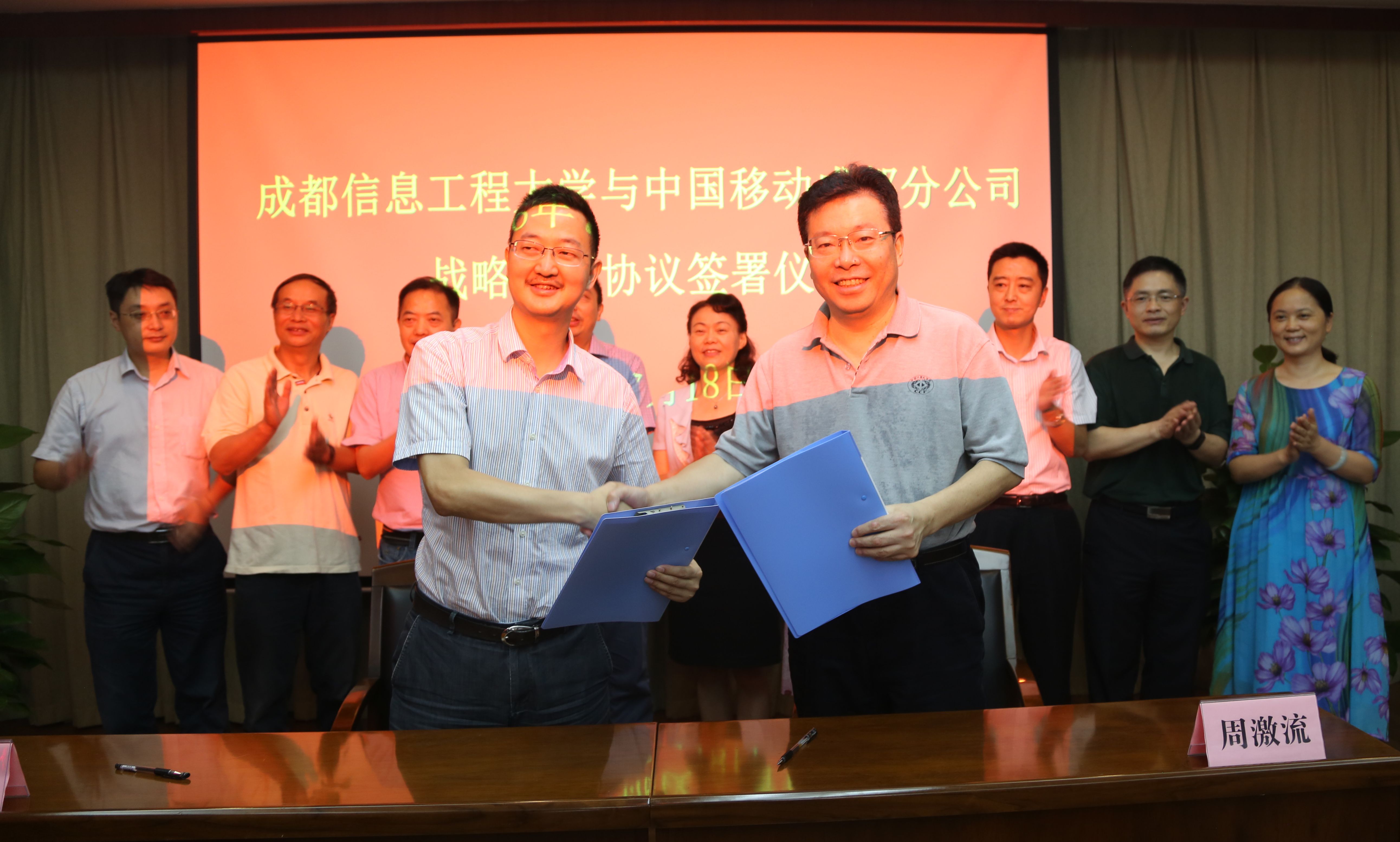在热烈的掌声中,周激流和刘耕分别代表我校和中国移动成都分公司共同签署了合作协议。此次协议的签署,不仅标志着我校与中国移动公司战略合作的开始,同时也标志着我校与移动公司全面合作的开始。未来双方将在校园网宽带业务,基站业务等方面开展实质性的、可持续的良好合作。在信息化建设、下一代互联网技术、大数据业务、学生实践基地及就业、大学生创新创业、联合人才培养方面等进行进一步的深度合作。