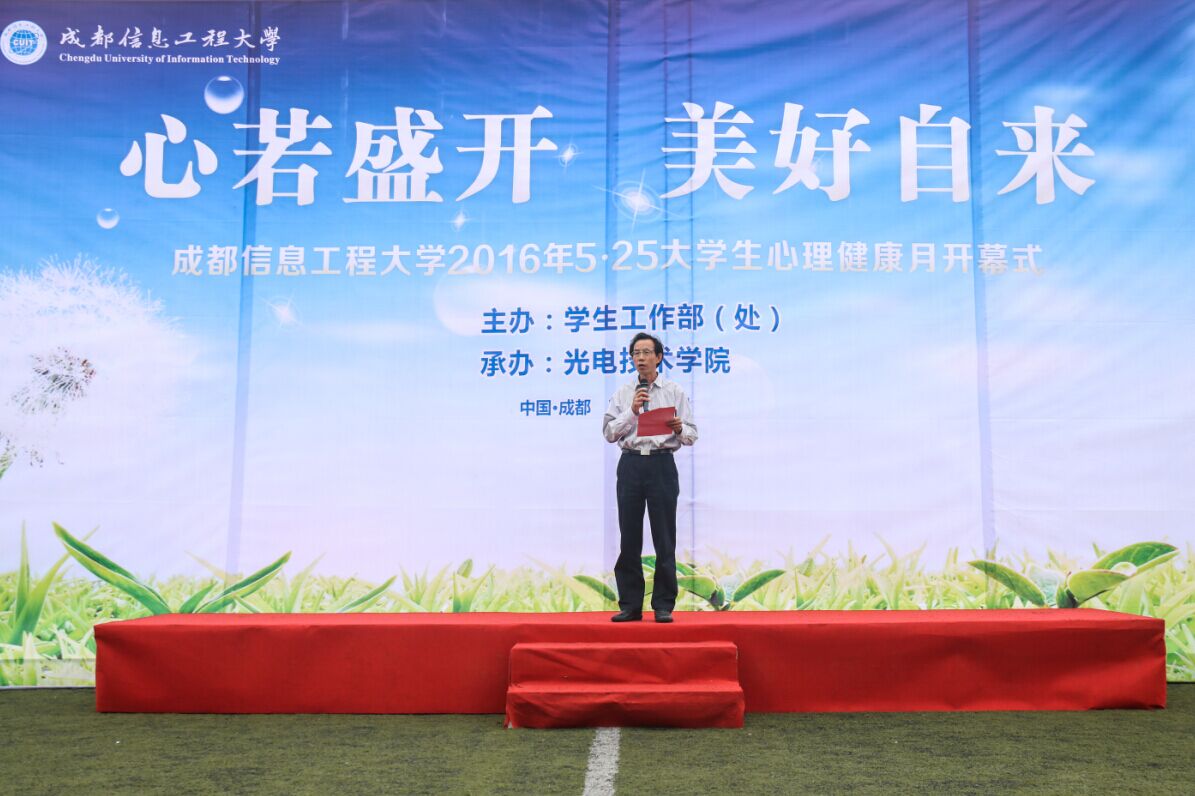赖廷谦致开幕词。他指出,学校历来重视大学生心理健康教育工作,通过课堂教育、专题讲座、心理普查、个别咨询、团体辅导、活动宣传等多种形式,全方位、多角度、有针对性地开展大学生心理健康教育。他强调,学生心理健康教育既是大学生自身成才的需要,也是时代发展的必然要求。关注大学生心理健康,积极开展大学生心理健康教育,对于积极推进大学文化建设,构建和谐校园有十分重要的意义。赖廷谦对同学们提出三点建议,即“强身健体、修炼心境、建立健康和谐的人际关系”。他希望通过此次活动,成信学子在快乐中学习,学习悦纳自己,悦纳他人;在尊重中成长,懂得尊严、责任与正直;在理解中进步,学会宽容、仁义和柔情。
