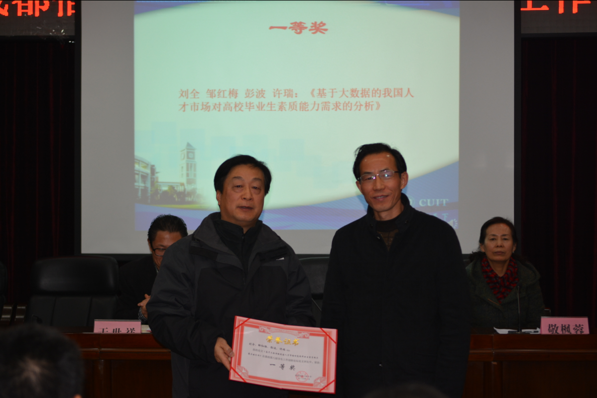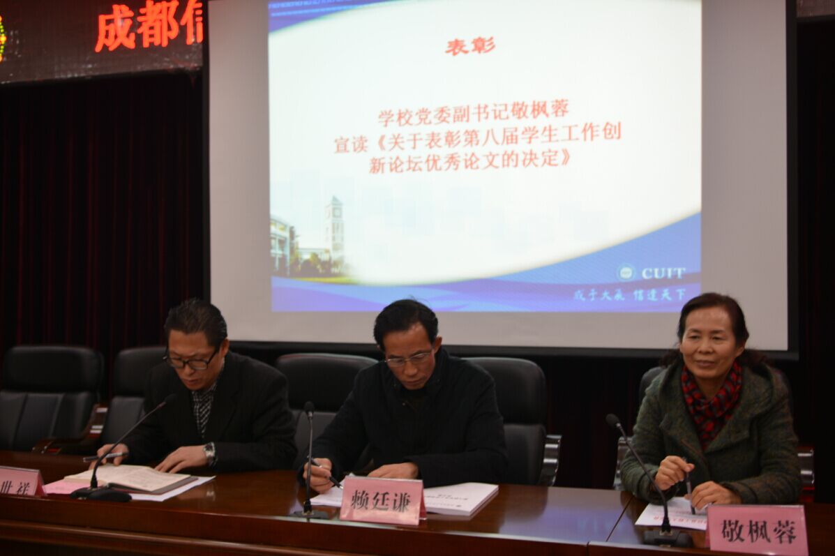 敬枫蓉宣读了《爱体育网页版关于表彰第八届学生工作创新论坛优秀论文的决定》。我校2015年第八届学生工作创新论坛共收到36篇论文,论文主题广泛、涉及面广,密切关注学生工作中的新现象、新情况,并提出了新的解决方案。大会对刘全等撰写的《基于大数据的我国人才市场对高校毕业生素质能力需求的分析》等11篇获奖论文给予了表彰。