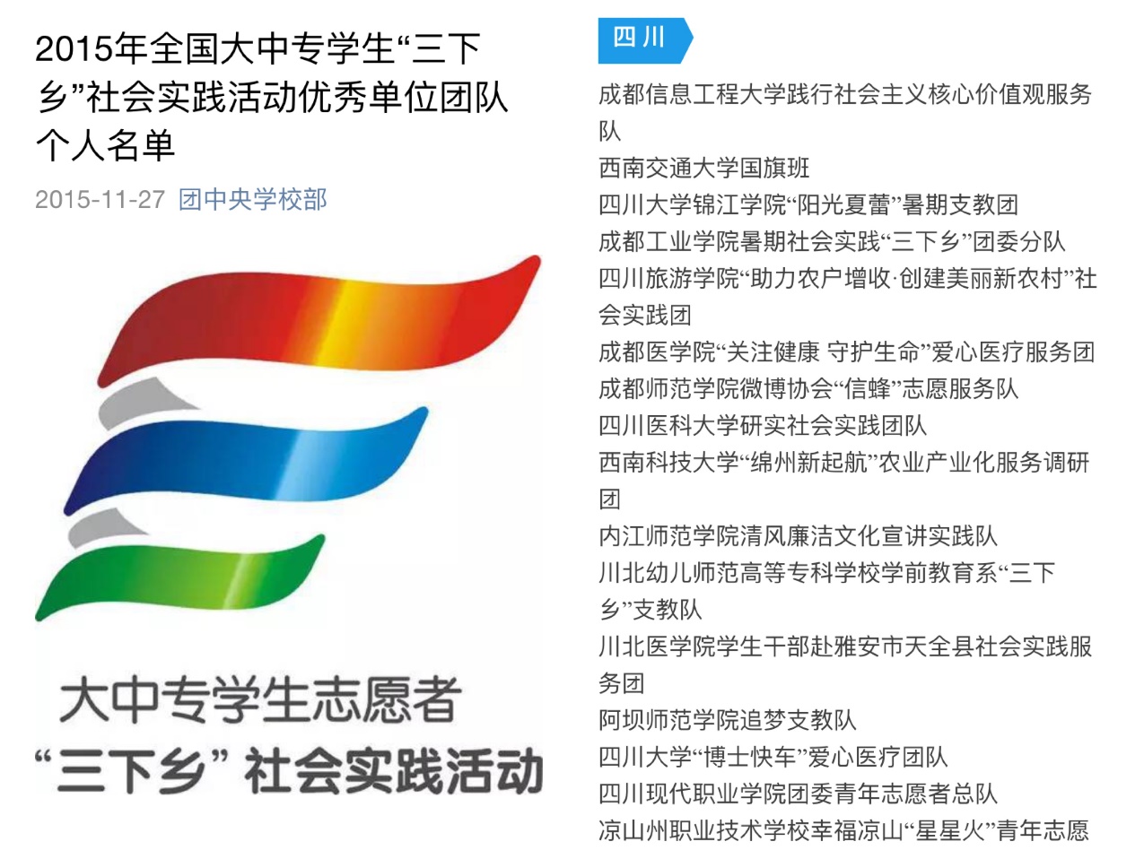 【本网讯】近日,从团中央学校部微信平台获悉,2015年全国大中专学生“三下乡”社会实践评选活动结果揭晓,我校“爱体育网页版践行社会主义核心价值观服务队”以四川省排名第一的成绩荣获2015年全国大中专学生“三下乡”社会实践优秀团队荣誉称号,成为全国400支获此殊荣的团队之一。