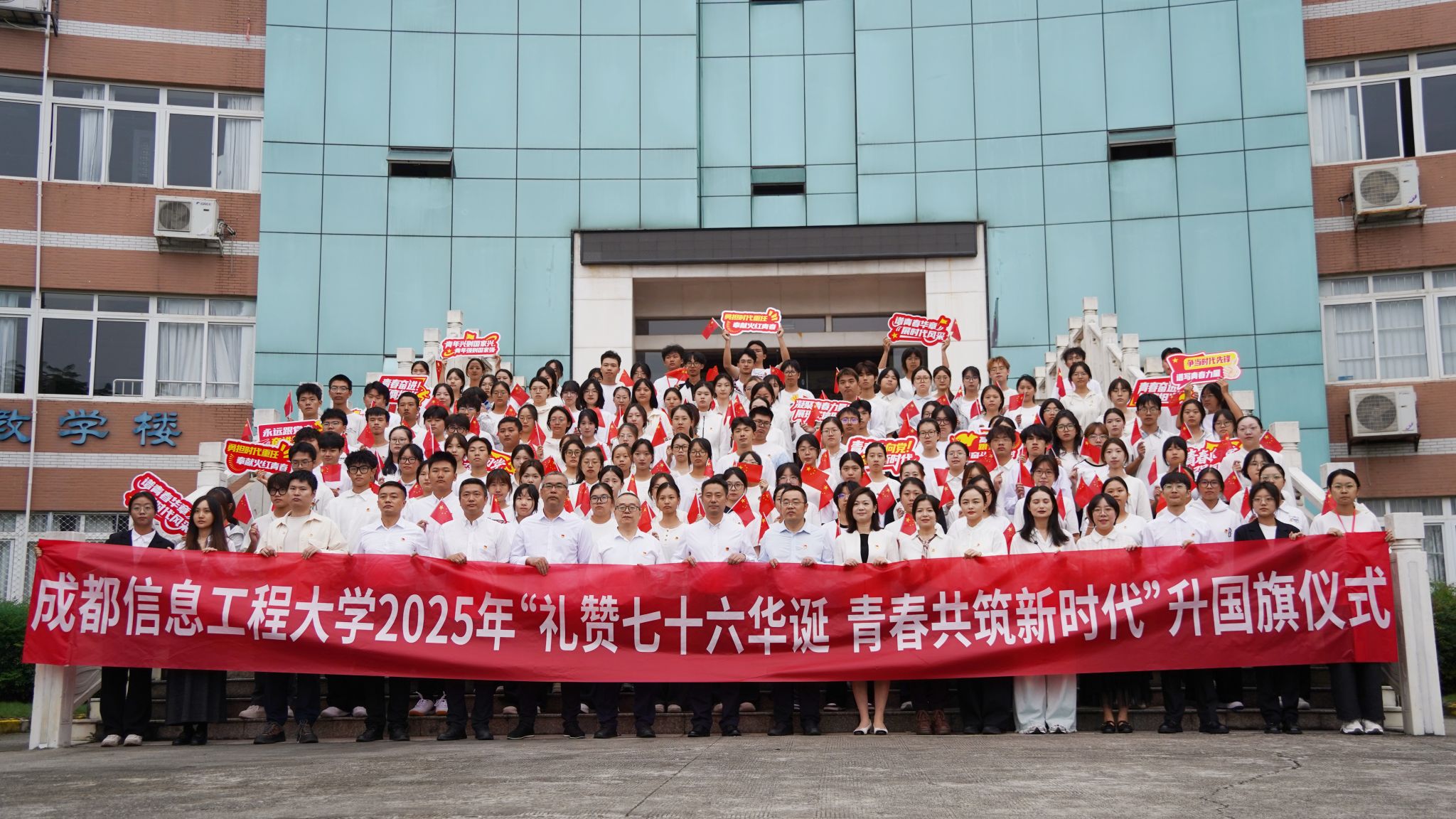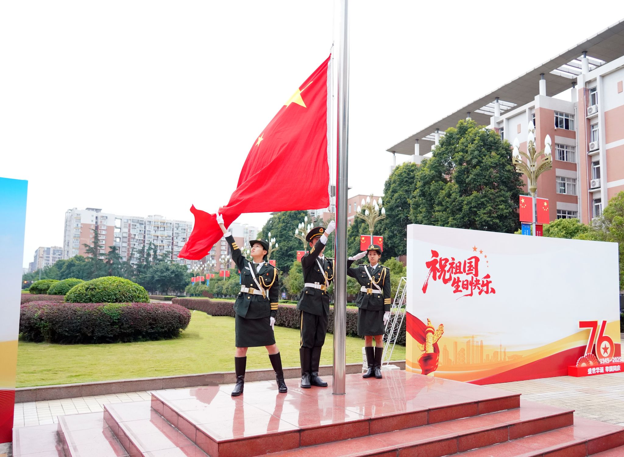 何建新、陈权亮分别在航空港、龙泉校区作国旗下讲话。何建新强调,76年前,新中国的成立犹如东方的一缕曙光,照亮了中华民族的历史长河。从艰苦卓绝的革命斗争,到波澜壮阔的改革开放,再到新时代中国特色社会主义的辉煌成就,伟大祖国走过了不平凡的历程。站在新时代的起点上,我们必须以更加饱满的热情、更加昂扬的斗志,投身到全面建成社会主义现代化强国的伟大事业中去。希望同学们要厚植家国情怀、树立远大理想、涵养高尚品德、强健心智体魄,在“向下扎根”的历练中积蓄“向上生长”的力量,成为民族复兴伟业的中坚力量;希望教师们时刻牢记为党育人、为国育才的初心使命,大力弘扬教育家精神,自信自强、踔厉奋发,为实现中华民族伟大复兴的中国梦而努力奋斗!