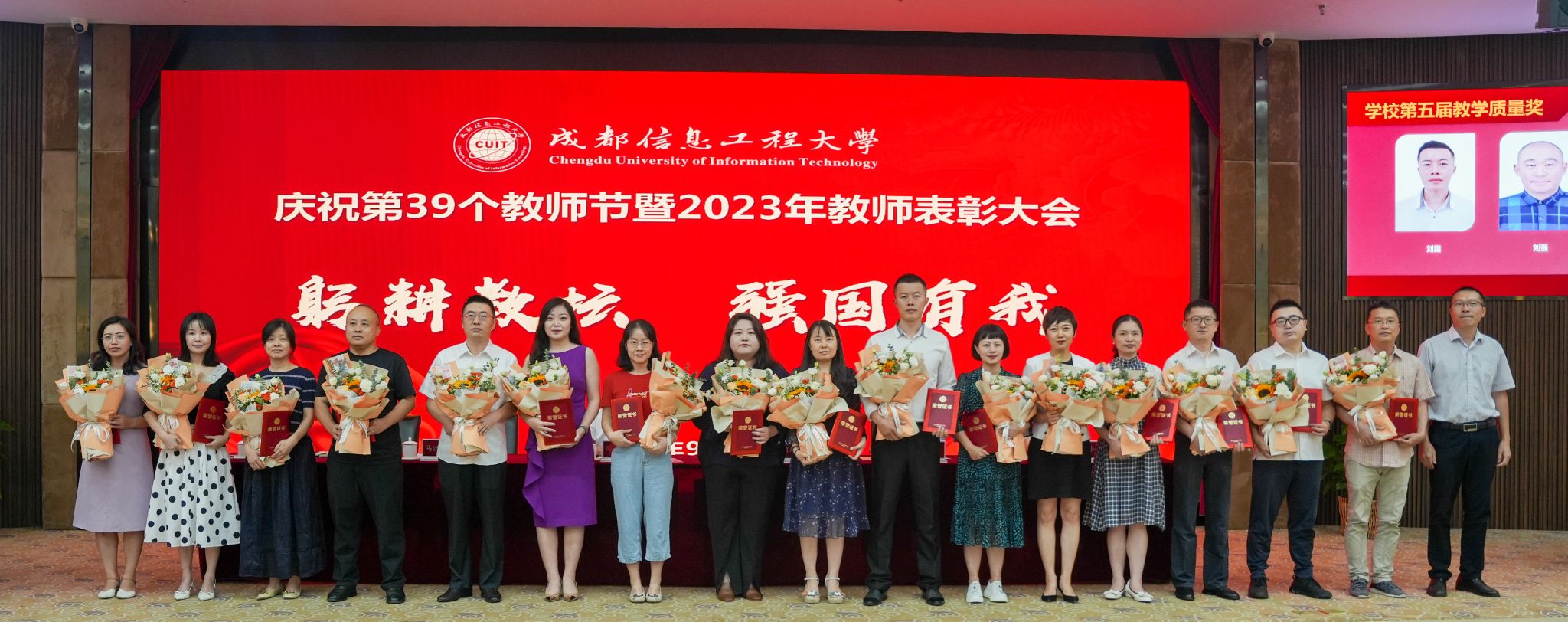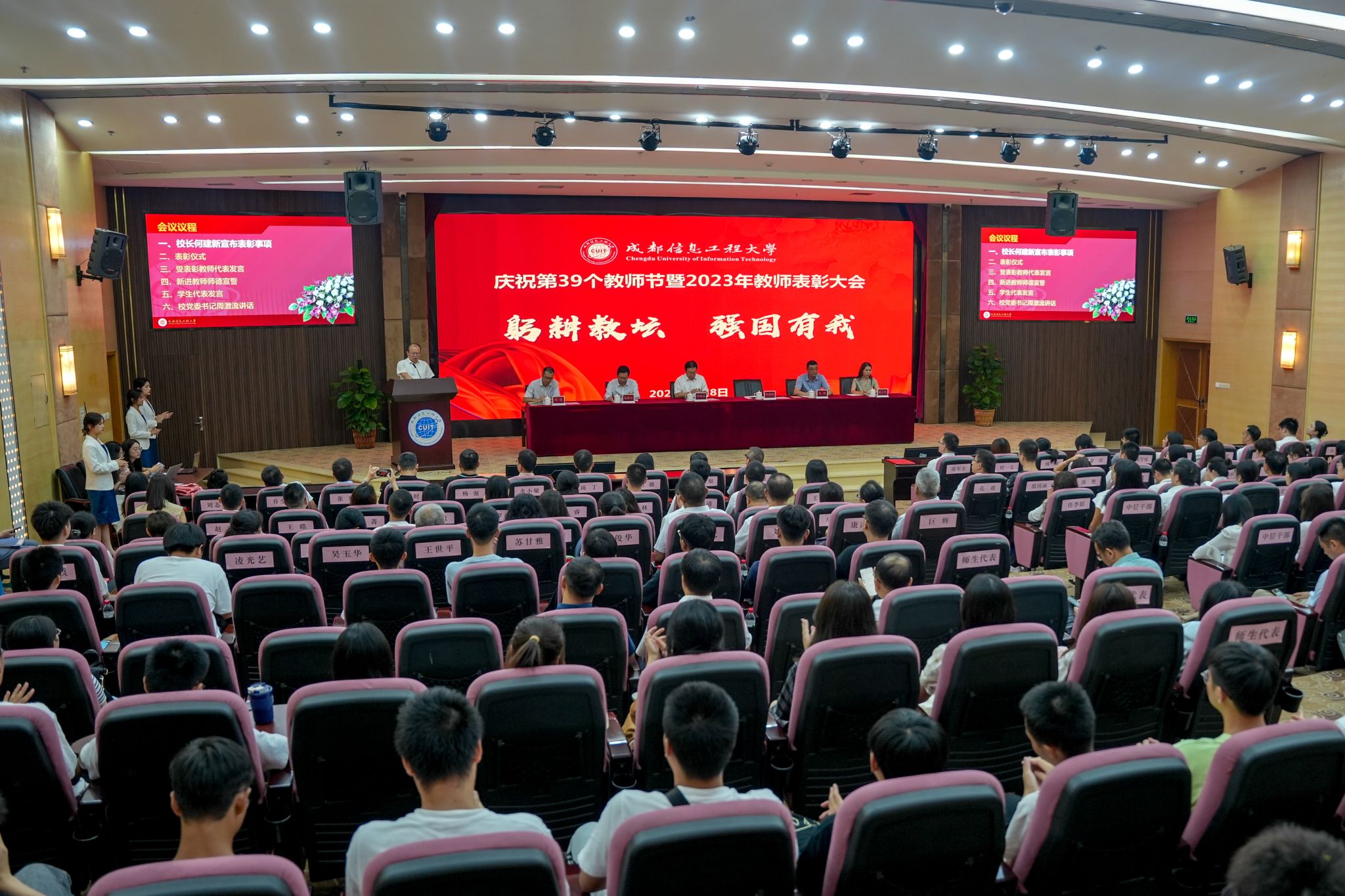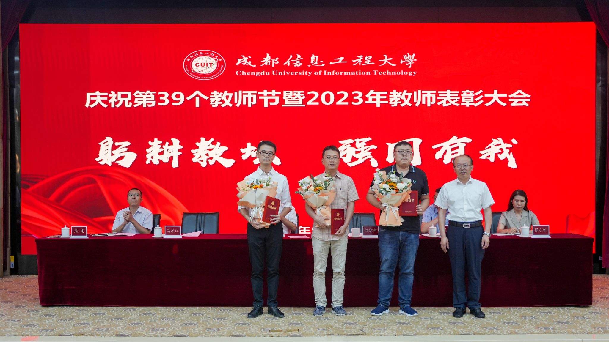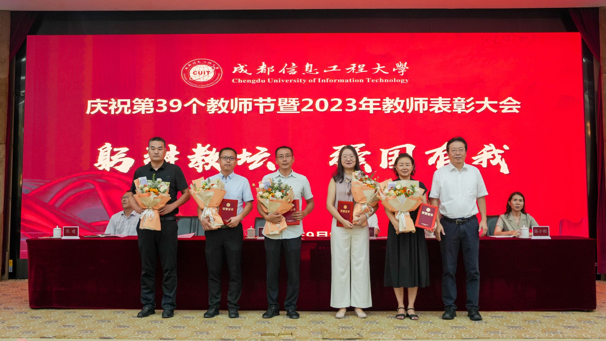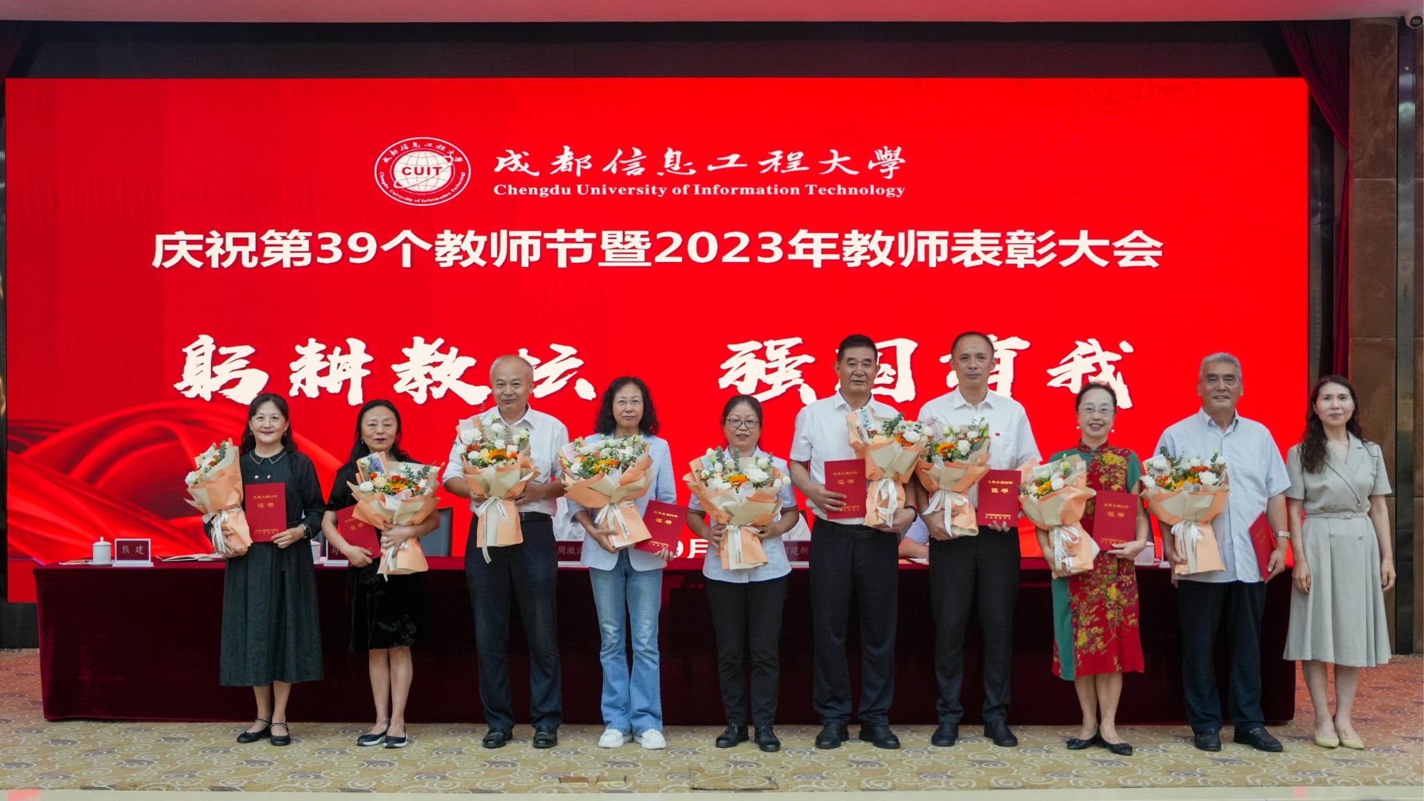 【本网讯】杏坛耕耘春化雨,倾尽丹心育桃李。9月8日下午,学校在航空港校区国际会议厅隆重举行庆祝第39个教师节暨2023年教师表彰大会。学校全体在校校领导,各二级党组织书记、各职能部门负责人、各学院(中心、部)负责人、各业务与产业部门负责人,受表彰教师、师生代表等参加表彰大会。会议由学校党委副书记马洪江主持。