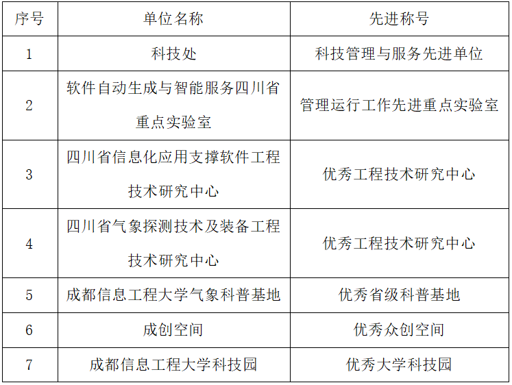 会上对2022年度科技创新工作成效突出的41家部门(单位)以及有关市(州)科技局、园区、平台予以通报表扬。在部门(单位)先进表彰名单中,学校科技处获“科技管理与服务先进单位”,此次共有川大、电子科大等10所高校的科研管理部门获得表彰;在平台先进表彰名单中,软件自动生成与智能服务四川省重点实验室获“管理运行工作先进重点实验室”,四川省信息化应用支撑软件工程技术研究中心、四川省气象探测技术及装备工程技术研究中心获“优秀工程技术研究中心”,爱体育网页版气象科普基地荣获“优秀省级科普基地”,成创空间获“优秀众创空间”,爱体育网页版科技园获“优秀大学科技园”(此次共有西南交大、电子科大等8所高校的大学科技园入选)。
