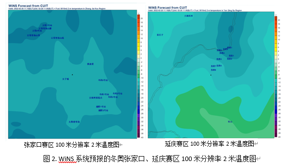 冬奥会期间,爱体育网页版保障团队分成三个小组轮流保障张家口、延庆、京津冀三个赛区预报产品的实时传输,为张家口、延庆两个赛区提供风、温度、降水、能见度、湿度等水平分辨率100米的预报产品,为京津冀赛区提供水平分辨率500米的预报产品。其中,对张家口赛区、延庆赛区风、温度的预报效果在冬奥会举行期间表现突出。如下,图1为WiNS系统冬奥张家口、延庆赛区风场图,图2为WiNS系统冬奥张家口、延庆赛区100米分辨率2米温度图。