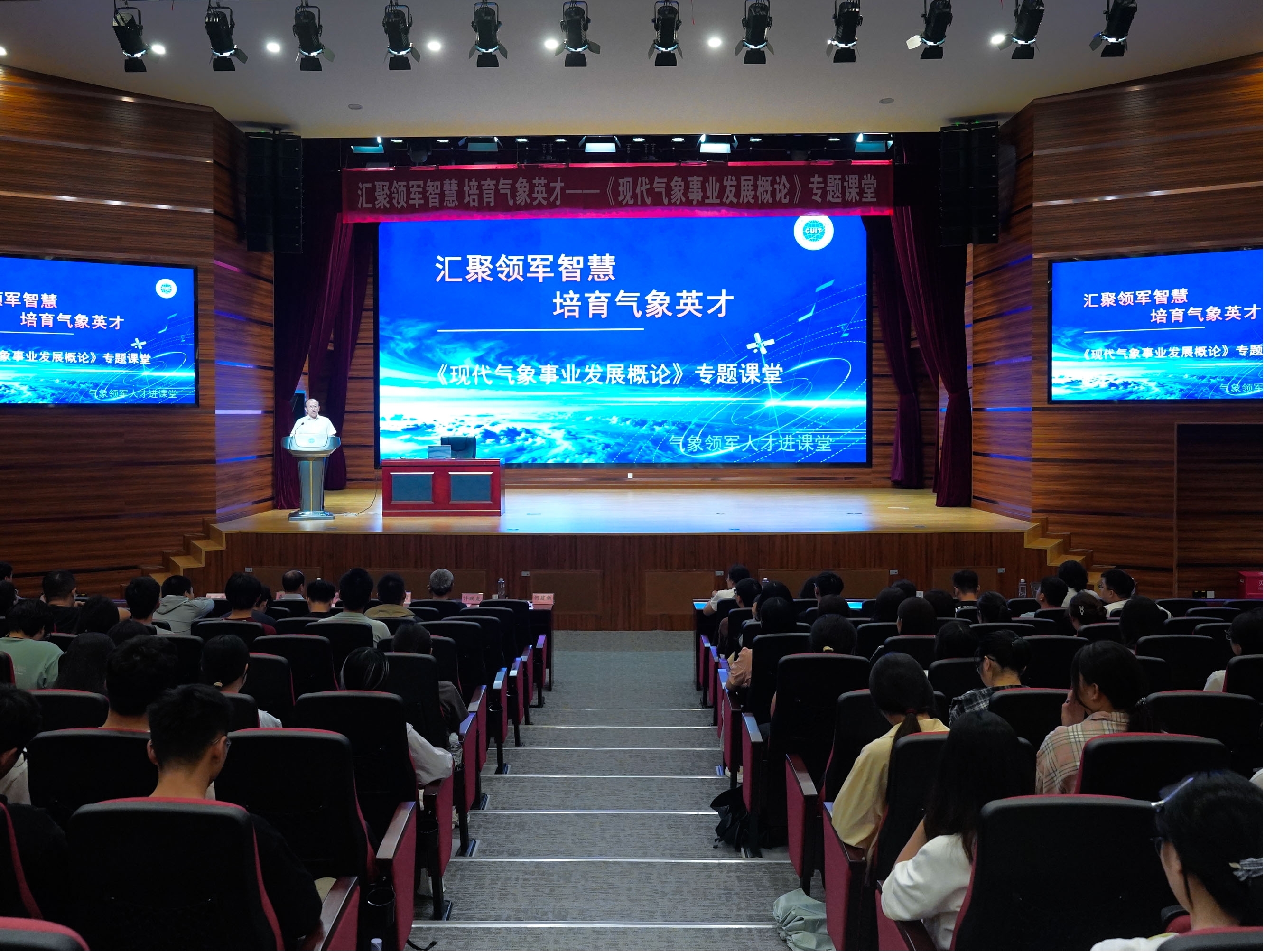 《现代气象事业发展概论》课程是在党的二十届三中全会关于教育科技人才一体化改革部署的指引下,依据《教育部中国气象局关于进一步加强气象人才培养工作的若干意见》的要求,为提升气象类专业学生的培养质量,由中国气象局和高校联合开展的“领军人才进课堂”活动的品牌课程。课程面向本科生和研究生开设的特色通识教育选修课。该课程构建了八个模块,内容丰富全面,涵盖“气象高质量发展理念与文化传承”“现代气象监测预报体系建设”“气候变化与国际合作”等关键领域。后续,多位全国气象领军人才将陆续走进课堂,他们将把几十年的宝贵经验和智慧毫无保留地传授给同学们,为同学们的成长成才提供强大的助力。