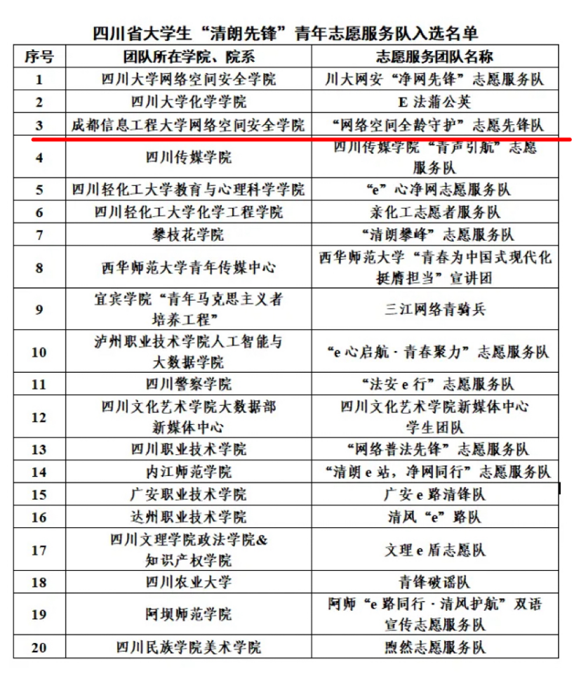 【本网讯】为深入学习贯彻习近平法治思想和习近平总书记关于网络强国的重要思想,深入宣传解读互联网法律法规,普及网络举报辟谣知识,提升青年学生对网络有害信息的辨识能力,中共四川省委网信办与共青团四川省委联合组织开展2025年在川高校大学生“e路同行 清风护航”青春志愿专项行动。此次行动面向全省高校选拔招募20支四川省大学生“清朗先锋”青年志愿服务队。我校“网络空间全龄守护”志愿先锋队脱颖而出,成功入选。
