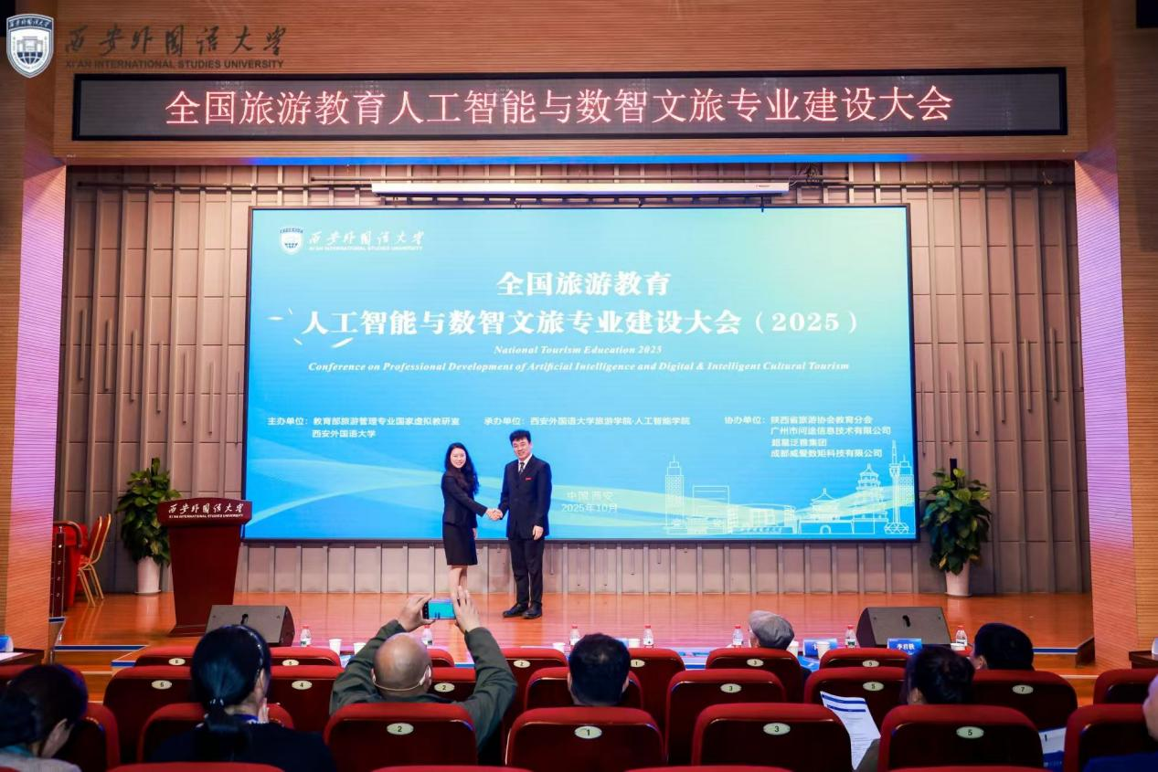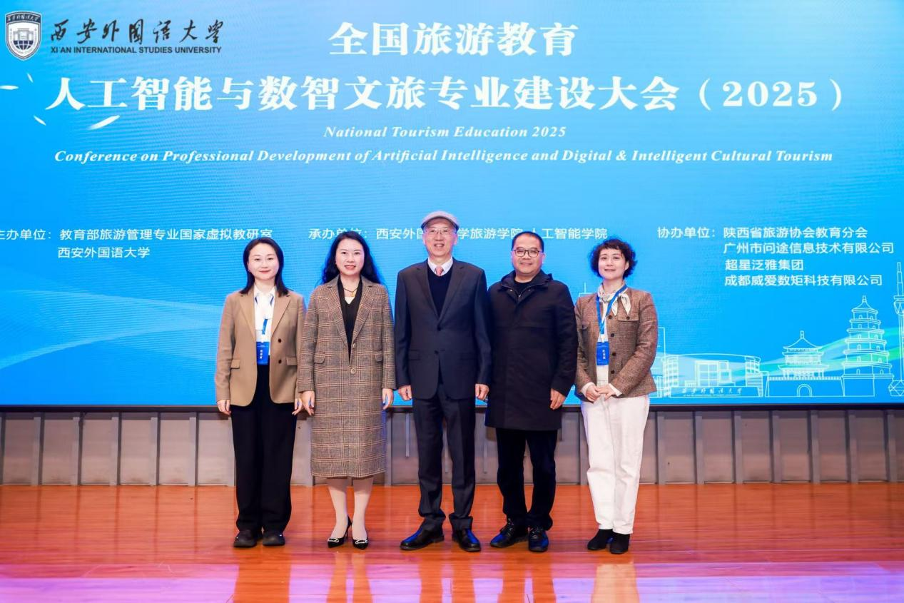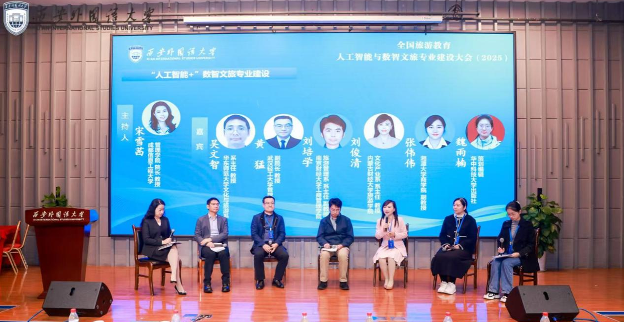 【本网讯】10月23日至25日,全国首届旅游教育人工智能与数智文旅专业建设大会(2025)在西安外国语大学长安校区召开。本次大会由教育部旅游管理专业国家虚拟教研室、西安外国语大学联合主办,西安外国语大学旅游学院与人工智能学院承办。大会聚焦人工智能与数智文旅领域前沿动态,汇聚全国高校旅游教育专家学者、政府部门代表、行业企业家及院校旅游管理专业负责人等160余人,共同探讨“人工智能重塑旅游教育新生态”。我校管理学院院长宋雪茜、旅游与营销系主任钱永贵、系副主任赵玮及实验室主任陈莹受邀参会。