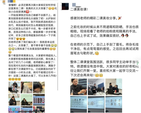 这场美妆课程不仅是一次技能学习,更是一场温情满满的情感交流。同学们在课程中互相试用化妆品,真诚地赞美彼此的进步。不少参与者表示,通过这次课程,不仅审美和实操技能得到了提升,还结识了许多志同道合的朋友。