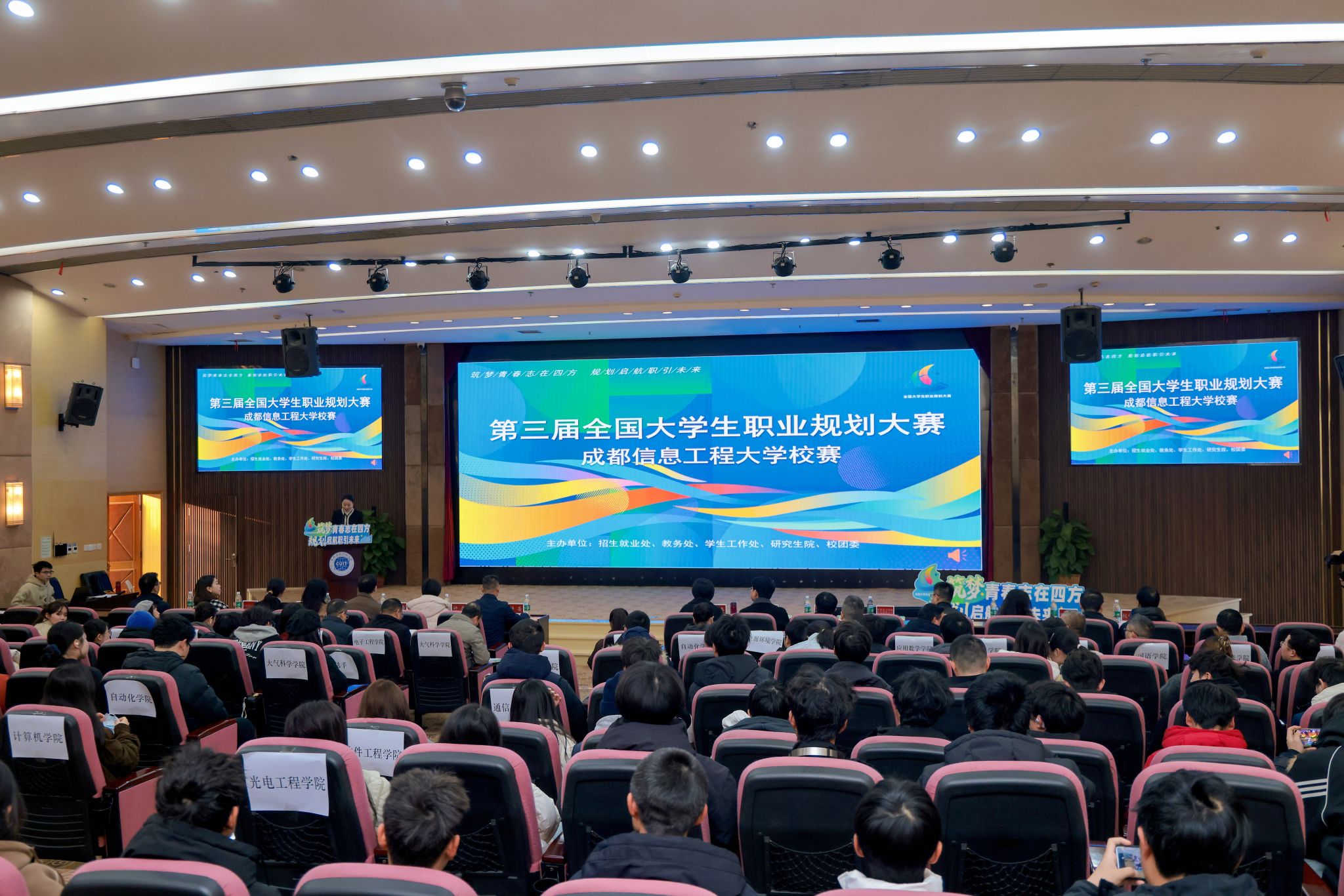 【本网讯】12月23日,学校第三届全国大学生职业规划大赛校赛决赛在国际会议厅、成信礼堂举行。本届大赛以“筑梦青春志在四方,规划启航职引未来”为主题,由招生就业处、教务处、学生工作处、研究生院、校团委主办,旨在深入贯彻国家关于高校毕业生就业工作的决策部署,全面落实立德树人根本任务,强化大学生职业规划意识与能力,助力学子科学规划人生航向,实现更高质量充分就业。