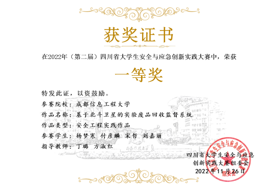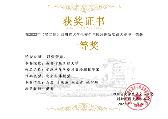【本网讯】近日,由四川省教育厅主办、西南科技大学承办的“第二届四川省大学生安全与应急创新实践大赛”决赛在西南科技大学落下帷幕,大赛分实体类、工程实践类、教育培训类、仿真与模拟类四个组别同时进行,各组别分固定题目和自由选题两大方向竞赛。本届大赛,我校共计28支队伍参赛提交作品,经过与来自全省16所高校434支队伍的激烈角逐,最终我校共计获得一等奖3项、二等奖2项、三等奖6项,资源环境学院丁璐老师、方淑红老师,大气科学学院樊晋老师、刘宇老师和李金建老师被评为优秀指导教师,学校被大赛组委会评为优秀组织奖。