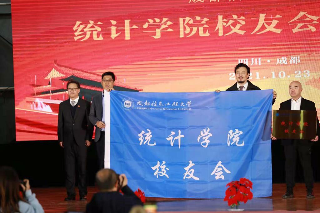 于世祥为统计学院校友会授牌并授会旗,谭平祥、钟勤建、晏正春、朱胜、金明、滕磊为统计学院校友会名誉会长、名誉副会长、会长、副会长、秘书长、副秘书长等颁发聘书。