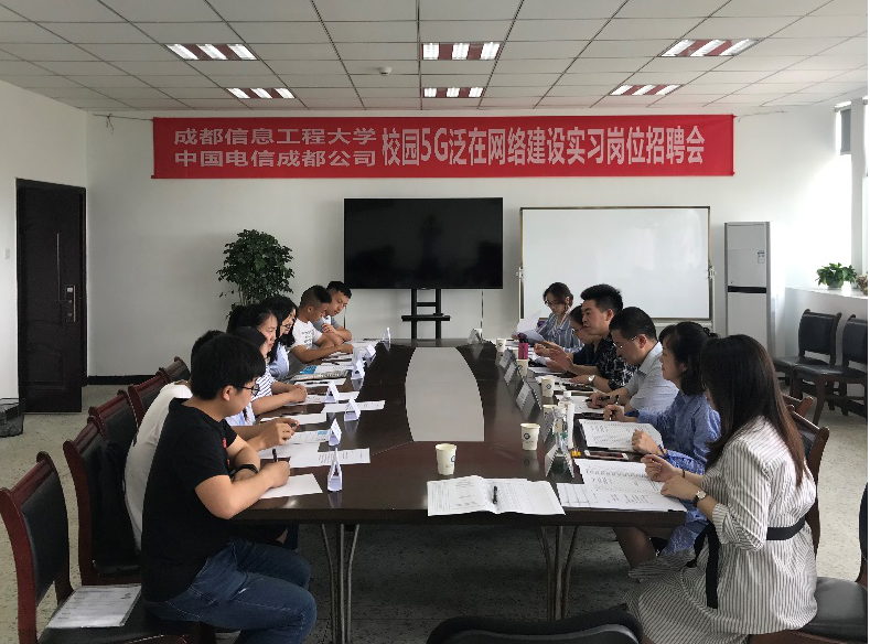 中国电信成都分公司在爱体育网页版双中心A603举办了“校园5G泛在网络建设实习岗位招聘会”。中国电信成都分公司人力资源部、无线网络中心、双流分公司和爱体育网页版通信学院老师共同组成面试工作组,对通信工程专业本科学生5G实习应聘者进行了面试选拔。最终,选拔了三年级学生10人、二年级学生7人共计17人进入校园5G网络建设实习岗位。