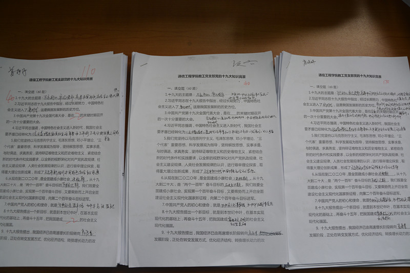 自党的十九大召开以来,为了让教职工党员第一时间学习领会党的十九大精神,通信工程学院在组织收看党的十九大开幕会后就及时组织开展多次集中学习,并为全体党员配发党的十九大报告单行本、文件汇编等学习辅导材料,要求党员通过书本学习、网络学习等形式开展个人自学。此次知识竞赛是对大家前期学习效果的检验,接下来支部还将开展主题党日活动对获奖的老师进行专门的表彰。
