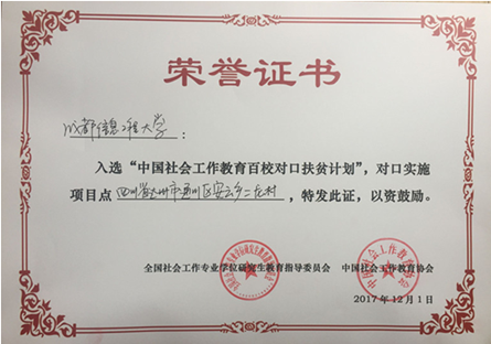为贯彻落实党的十九大精神,按照党中央、国务院关于打赢脱贫攻坚战的一系列决策部署要求,充分发挥社会工作专业在扶贫领域的优势作用,民政部、财政部、国务院扶贫办联合下发了民发〔2017〕119号《关于支持社会工作专业力量参与脱贫攻坚的指导意见》文件,文件对“实施社会工作教育对口扶贫计划”提出了明确要求。全国社会工作专业学位研究生教育指导委员会、中国社会工作教育协会联合启动了“中国社会工作教育百校对口扶贫计划”,该计划将持续进行到2020年,首批入选110所高校,四川地区5所高校入围。