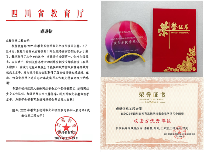2.在2025年全省教育系统网络安全攻防演习中获省教育厅发文表彰为优秀单位,并作为6所受邀院校之一代表省队参与教育部组织的全国教育系统攻防演习,助力四川省获得全国第一,获省教育厅发文感谢。