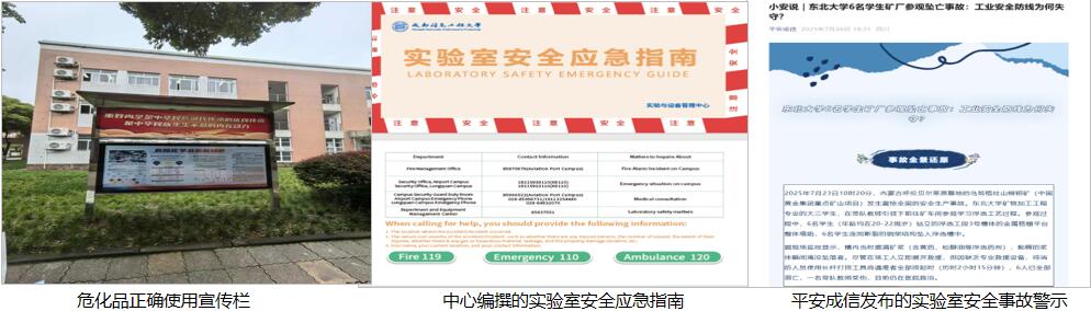 安全是实验室工作的生命线。中心年初即协同保卫处完成全校校-院两级实验室安全责任书签订,并定期检查二级单位制度与责任落实情况。通过“平安成信”公众号、宣传栏、安全标识上墙、编撰应急手册等多渠道加强安全文化建设。全年组织7次应急演练,覆盖师生超1000人,并实现了2025级全体本硕博新生的实验室安全准入考核全覆盖。牵头组织“全覆盖”安全检查3次及锂电池、危化品等专项检查7次,形成“检查-整改-回头看”闭环管理,持续完善实验室安全环境。