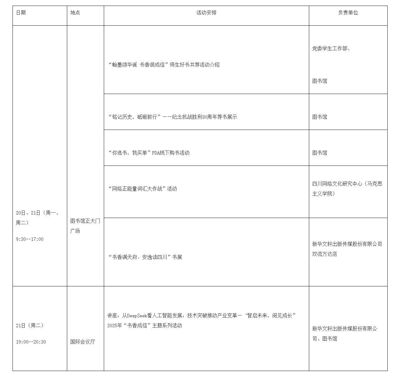为进一步倡导全民阅读、终身学习的文明风尚,努力建设学习型社会,由四川省委宣传部指导、天府书展组委会主办的“天府书展进校园”活动将于10月20-21日在爱体育网页版举行。学校图书馆在此背景下结合2025年度“书香成信”活动方案,设计了系列活动,期盼师生们在阅读中开阔视野,陶冶情操,提升文化素质。现将活动安排通知如下,欢迎广大师生积极参与!