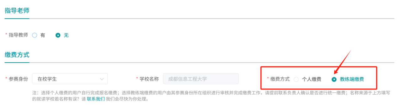 报名信息的“缴费方式”统一选择:教练端缴费(如下图所示)