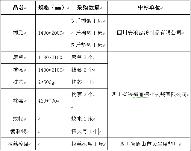 根据四川省纤维检验局提供的质量标准和《爱体育网页版学生公寓床上用品招标公告》的要求,我校招标小组于2016年5月26日对投标单位提供样品的质量和价格进行综合比选评标,拟确定2016年学生公寓床上用品的中标单位如下: