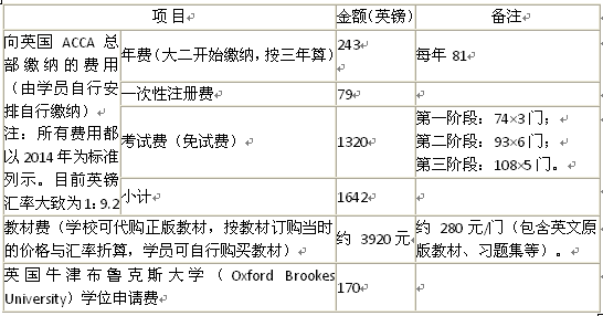 ACCA培训费标准定为10000元/年(不含学校本科学费)。学制四年,培训费总计40000元,按年收取,每学年开学后与学费一并缴纳。