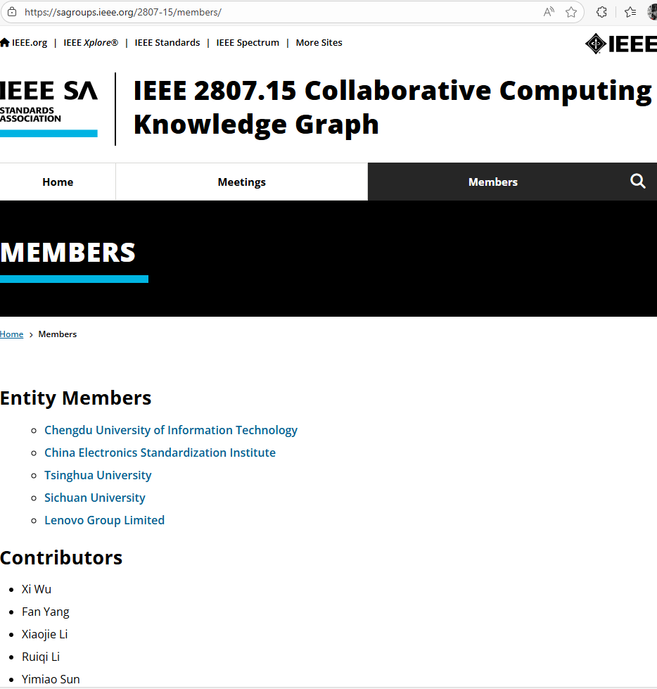 【本网讯】近日,由爱体育网页版牵头,联合中国电子标准化研究院、清华大学、四川大学及联想集团共同发起的IEEE技术标准:Standard for Collaborative-Computing-Network-Oriented Knowledge Graph(《面向协同计算网络的知识图谱标准》),成功通过IEEE标准协会(IEEE SA)批准,正式立项,项目编号IEEE P2807.15(IEEE官网:https://sagroups.ieee.org/2807-15/)。这一里程碑事件标志着我校在协同计算网络与知识图谱交叉领域的技术成果获得国际权威认可,助力我国在人工智能与协同计算领域的国际规则话语权的进一步提升。