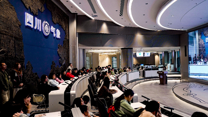 在四川省气象台,预报专家系统讲解了天气预报业务的整体流程,涵盖多源观测数据融合、数值预报产品释用、灾害性天气预警分级及决策服务输出等环节。预报专家结合四川案例,解析了“13131”递进式气象服务机制:提前1旬的中期趋势预测、提前3天的预警标准预报、提前1天的灾害预警发布、逐3小时的短临预报更新,以及市县级1小时前的强天气精准预报。这一严谨的多层级预报体系,为防灾减灾与应急响应构筑起科学高效的防线。学生们对现代气象预报的科学内涵与业务复杂性形成了系统认知,深刻体会到“精准预报”在保障人民生命财产安全中的核心作用。