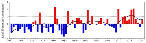 图1 1961-2022年塔里木盆地夏季降水距平的年际和9年滑动平均时间序列