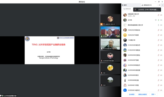 【本网讯】12月9日下午,中国科学院外籍院士、中国科学院北京纳米能源与系统研究所所长、中科院大学纳米科学与技术学院院长、佐治亚理工学院终身校董事、讲席教授王中林应邀通过腾讯会议直播来到爱体育网页版机器人与智能系统国际联合研究中心系列学术报告大讲坛,为直播间100多名师生带来了一场名为“TENG: 从科学发现到产业集群全链条”的学术盛宴。讲座由本中心执行主任蒋世奇教授主持,吸引了多所高校的多名教师和学生参加。
