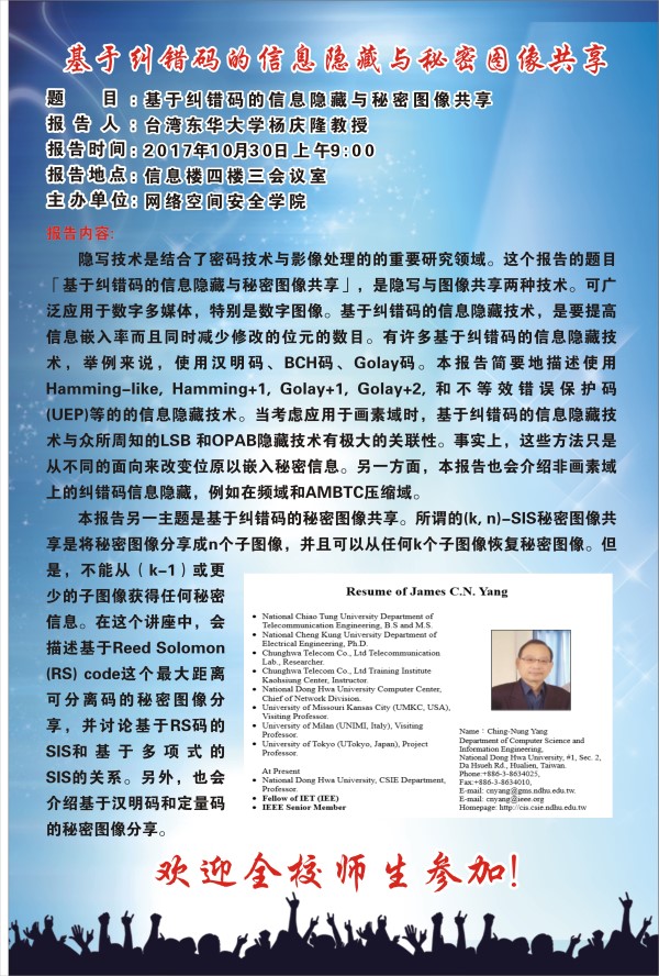 来源:网络空间安全学院 作者:杨润萍日期:2017-10-26 审核:新闻中心 点击: