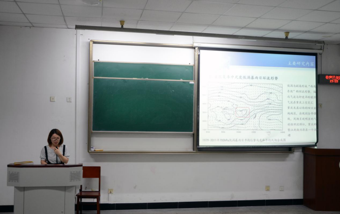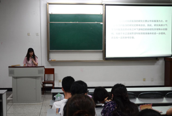 周可作题目为《青藏高原大气季节内振荡及其对长江中下游地区持续性异常降水的影响》的报告。她研究了青藏高原夏季(6-8月)的季节内振荡变化,分析了显著周期对其传播路径、环流系统等特征的影响。