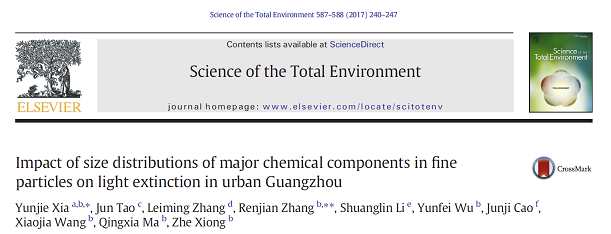 【本网讯】近日,大气科学学院研究生夏芸洁以第一作者身份,在国际知名期刊《Science of the Total Environment》上发表了名为“Impact of size distributions of major chemical components in fine particles on light extinction in urbanGuangzhou”的学术论文。中国科学院大气物理研究所研究员张仁健、研究员李双林为共同导师及通讯作者,爱体育网页版为第一署名单位。