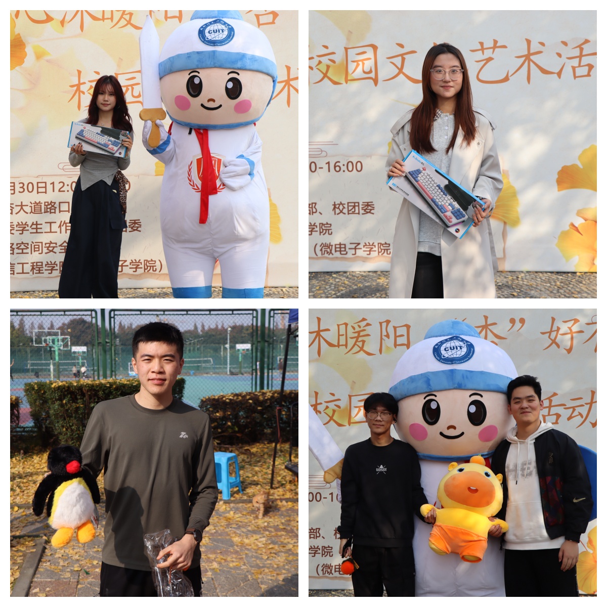 活动准备了丰富精美的纪念品,同学们通过参与互动即可积分兑换玩偶、键盘、鼠标等多重好礼。现场更有人气十足的吉祥物玩偶穿梭其间,与同学们亲切互动,一张张洋溢着青春笑容的合影,定格了这个银杏纷飞的午后。