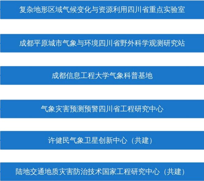学院目前拥有复杂地形区域气候变化与资源利用四川省重点实验室、气象灾害预测预警四川省工程研究中心、成都平原城市气象与环境四川省野外科学观测研究站等省部级科研与创新平台,并建有气象预报四川省实验教学示范中心、气象预报四川省虚拟仿真实验教学中心以及蜀南山地生态气象综合观测试验站、西南空管局航空气象创新联合实验室、中电投电力工程有限公司电力气象联合实验室、爱体育网页版云南自然灾害防御技术研发中心等教学研究平台。学院建有爱体育网页版气象科普基地,是以气象防灾减灾、气候变化和生态文明为特色的国、省、市三级科普基地。