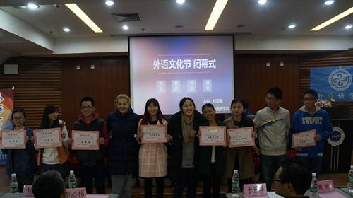 为活跃闭幕式气氛,大会安排了精彩的节目。缪怡然同学为大家带来了“英美文化”演讲;于姝宁、郭小侨同学献上了悦耳的英文歌曲,文化艺术学院再次演绎了英语原声电影配音的视听享受;罗旭辉同学的一曲《 Apologize》的优美歌声引来台下观众的阵阵欢呼。闭幕式上出席闭幕式的嘉宾为获得本届外语文化节的获奖者颁发了一、二、三等奖和优秀奖。最后,外国语学院黄驰副院长致闭幕词并宣布本次外语文化节闭幕。(来源;外国语学院 作者:刘鋆 审核:新闻中心)