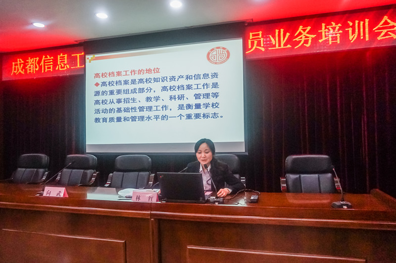 【本网讯】为全面提升学院专兼职档案员档案意识和业务素质,充分发挥兼职档案员的职能作用,促进档案管理工作更好地服务学院建设发展,4月13日,学院在行政楼一会议室举办了全院专兼职档案员业务培训会。省档案局经济科技档案业务指导处林红处长、王晓瑜副处长亲临授课,学院党委常委、副院长向武,全院专兼职档案工作人员50余人参加了培训会。会议由党政办公室副主任李林襁主持。