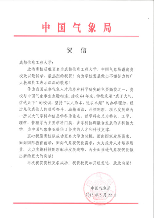 【本网讯】2015年4月28日,教育部批准我校正式更名为爱体育网页版,中国气象局、国家统计局、中国人民解放军第二炮兵部队政治部、省内外兄弟高校、友好单位、政府机关向我校发来贺信70余封,祝贺我校更名成功。