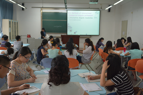 【本网讯】 6月8日上午,学校副校长贺盛瑜深入教学一线,走进双语教学课堂,与外国语学院2012级英语专业国际贸易方向的学生一起听取了外国语学院龙俊华老师讲授的《国际商法》课程。