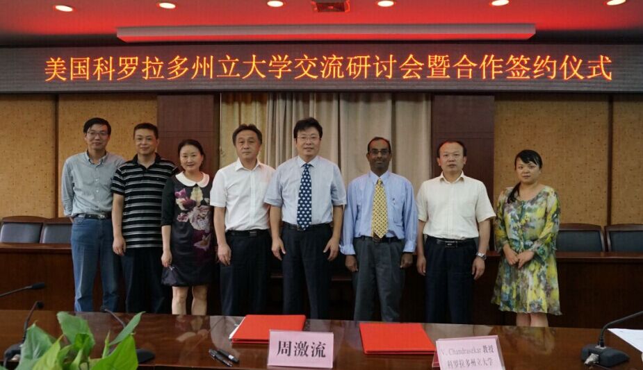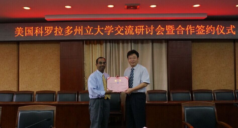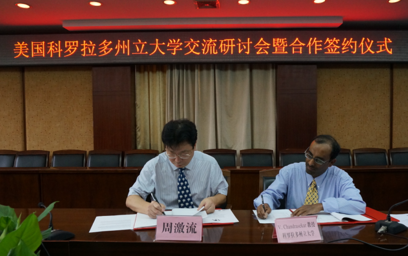 周激流对Cha ndrasekar提出的关于两校的合作模式表示赞同,提议在两校之间开展2+2,3+1,Summer School等多种合作模式的联合硕士、博士生培养;在科研方面,可以参考科罗拉多州立大学与美国相关研究机构的合作模式,由国内外相关领域专家指导在我校建立开放的研究平台,并持续开展科研合作。会议期间,周激流代表学校聘请Cha ndrasekar为首席教授(Presidential Professor)。