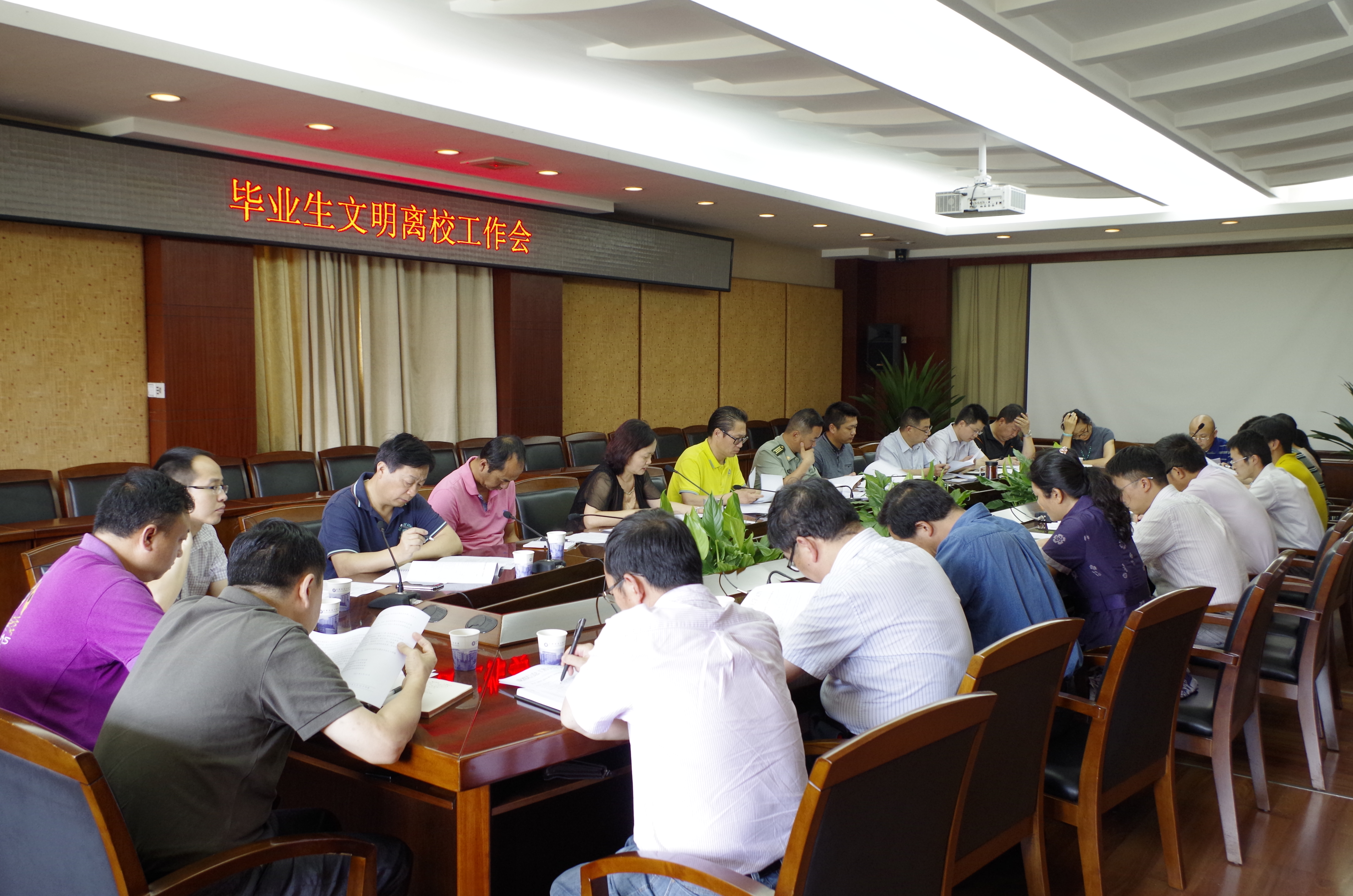 【本网讯】6月17日下午,学校在行政楼第七会议室召开2015届毕业生文明离校工作会。党政办公室、组织人事处、宣传统战部、教务处、研究生处、学生工作处、驻校选培办、招生就业处、校团委、计划财务处、保卫处、图书馆、信息中心、后勤管理处、后勤服务公司等单位负责人,各学院党总支书记、副书记,学生工作处相关人员参加了会议。会议由学校副校长于世祥主持。