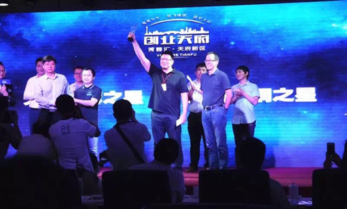 最后,我校成创空间推荐的孵化团队“通甲优博”在项目路演中在成都团队夺冠,荣获“天府菁蓉之星”奖杯,并由俞敏洪为其颁奖!