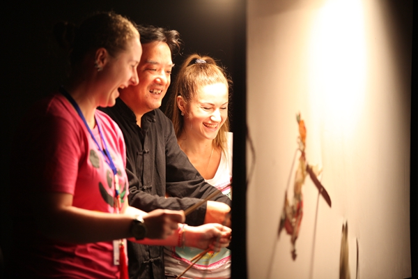 在我校的欢迎仪式上,来自我省的民俗艺术大师和我校文化艺术学院中国剪纸艺术团同学们为观众们带来了精彩纷呈的中国民间艺术表演:糖画、皮影、剪纸和泥塑,让大家饱了眼福、口福和耳福。展示了高超的技艺之后,现场的互动环节也引起了俄罗斯青年们的极大兴趣,他们兴致勃勃,或登台体验、或共同切磋,现场气氛高涨。