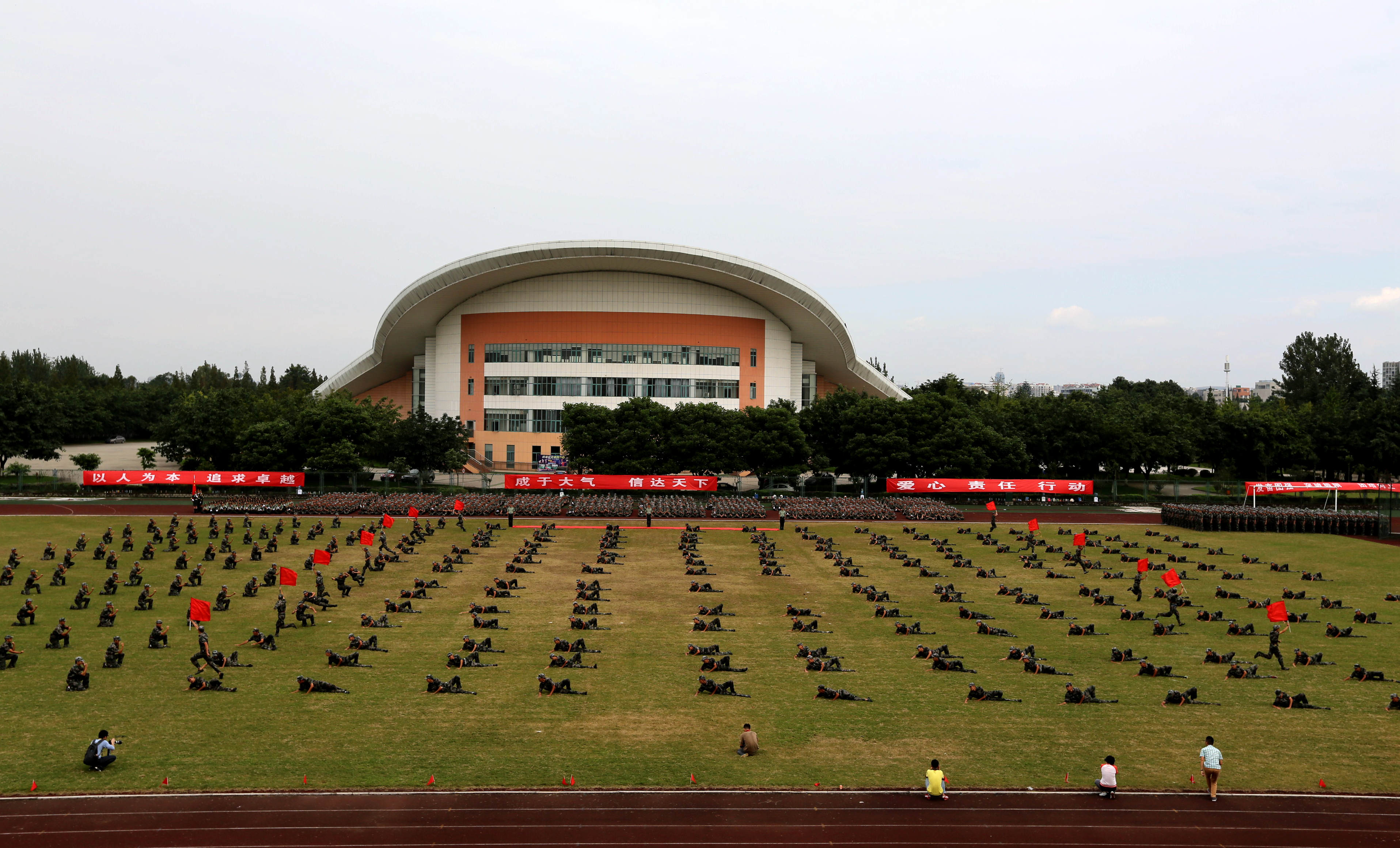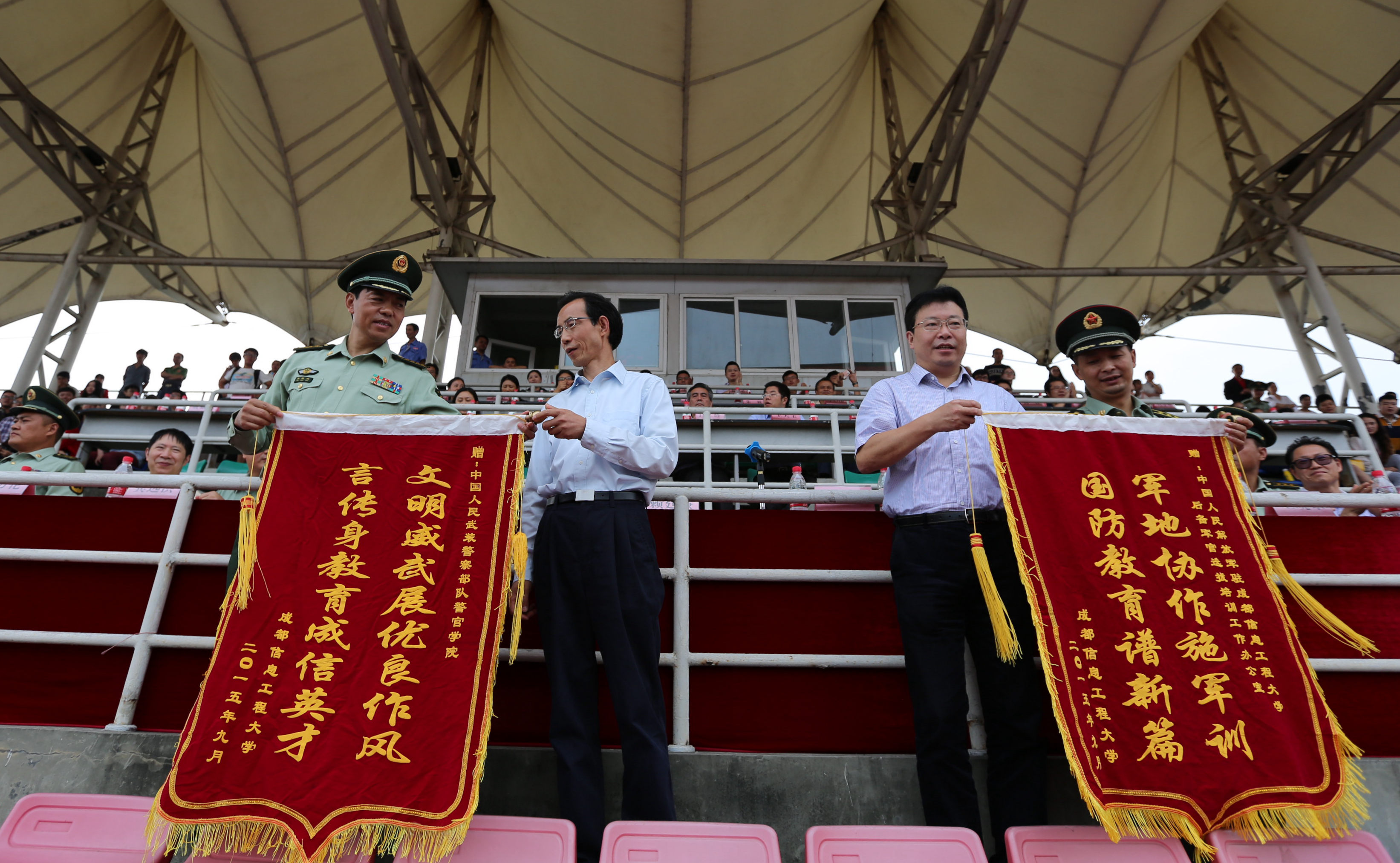 【本网讯】9月25日,学校分别在龙泉校区和航空港校区隆重举行2015级新生军训总结大会暨开学典礼。学校党委书记赖廷谦,校长周激流,副书记敬枫蓉、倪鸣,副校长余万伦、于世祥、向武、何建新,武警警官学院副院长孙振廷大校、训练部副部长雷敏大校等领导,四川省军区军训办副主任龚远洪上校,及学校相关职能部门负责人,各二级学院领导,全体军训教官,2015级全体新生和新生辅导员参加了大会。大会由于世祥主持。