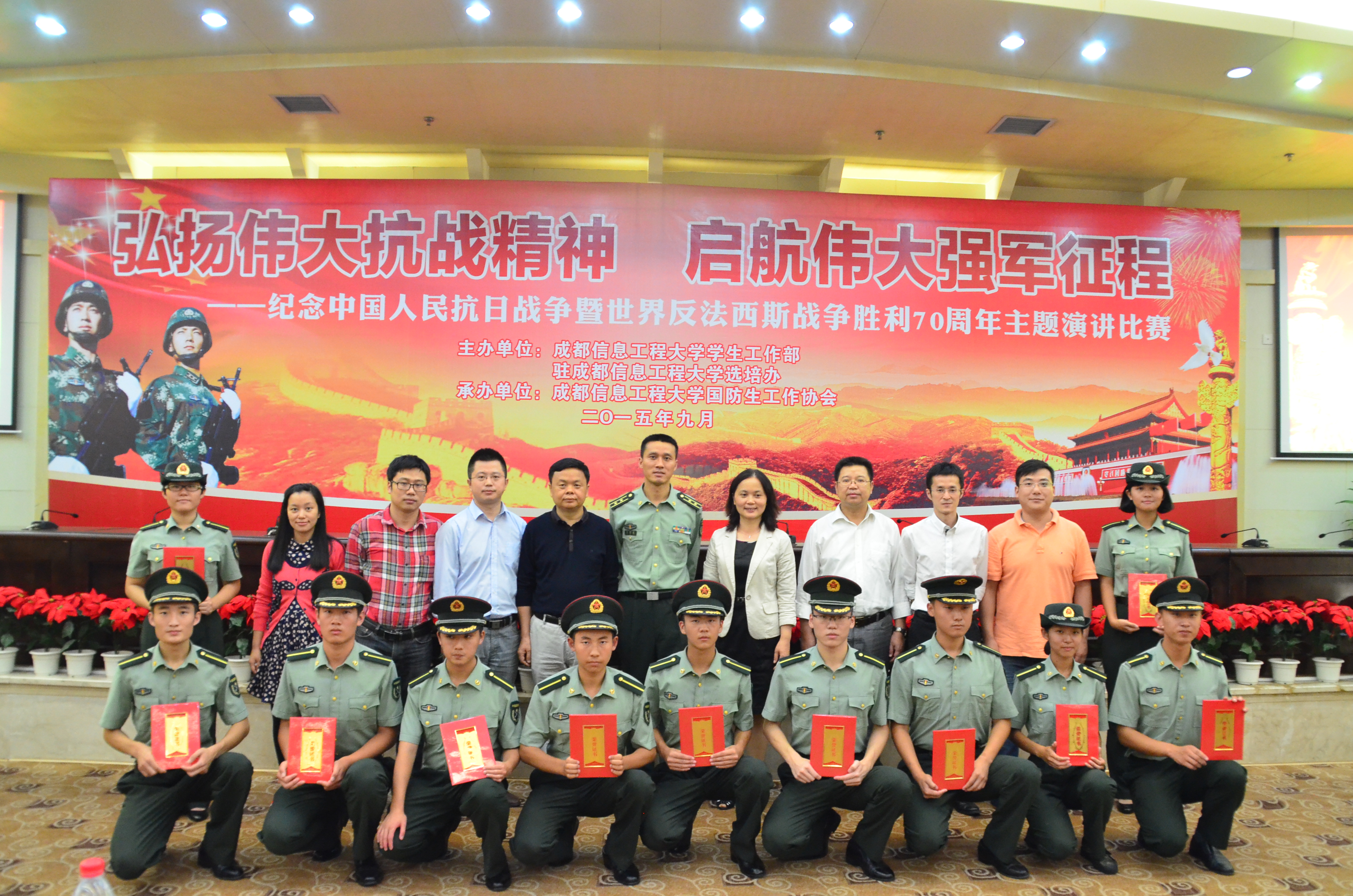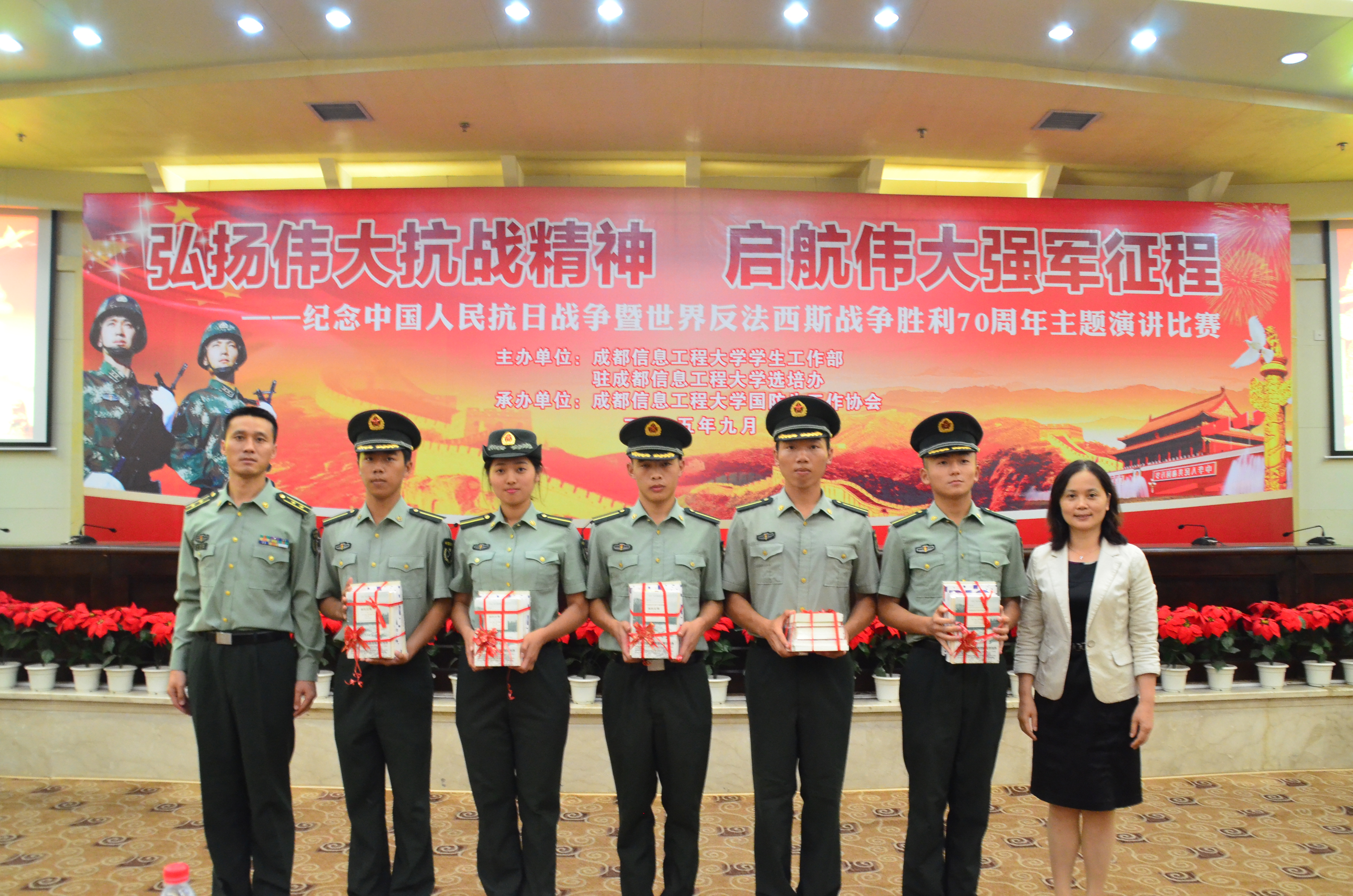 【本网讯】铭记历史,缅怀先烈,珍爱和平,开创未来。为纪念中国人民抗日战争暨世界反法西斯战争胜利70周年,9月29日晚上7:00,学校在国际会议厅隆重举行“弘扬伟大抗战精神,启航伟大强军征程”国防生主题演讲比赛。参赛选手为国防生模拟连队推选的代表。学生工作处处长戴丽红、副处长陈智勇,资源环境学院党总支书记刘绍全、电子工程学院党总支副书记彭勇、计算机学院党总支副书记朱正华,学生工作处学生管理科科长孙毅、大气科学学院国防生辅导员刘宇,学生工作处老师徐园园,驻校选培办干部担任评委。
